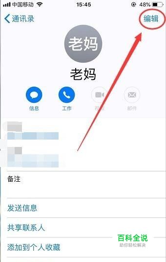 首先打开手机通讯录,找到重要联系人电话页面,点击右上角的 编辑,如下图