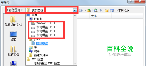 然后会弹出另存为对话框,如图所示,单击“保存位置”下拉表框,在列表中选择盘符,比如D盘。