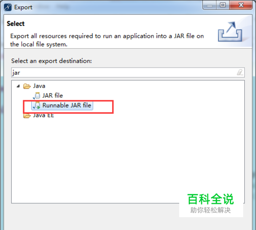 第二步,在输入框里搜 jar,选择>> Runnable JAR file,点击>> next