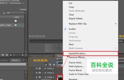 将素材放在轨道,右键需要变速的素材,选择Speed/Duration...,如图: