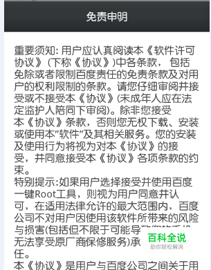 打开百度一键root,同意免责声明(如果怕手机出问题就不要同意了--)