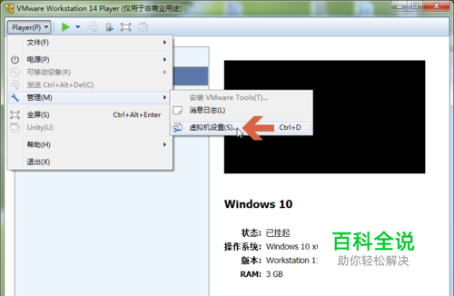安装VMwareTools后,点击【player】菜单中的【管理--虚拟机设置】,打开设置界面。