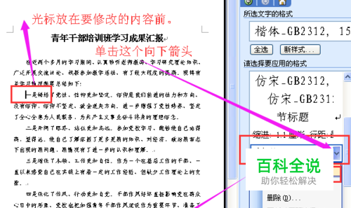 在文档的右侧会出现一个“格式和样式”窗口。比如说我更改一下我的小标题,将鼠标的光标放在“一是锤炼了党性,信仰更加坚定”前面。在右侧窗口中选择蓝框中向下箭头,并点击”选择所有5实例“选项。