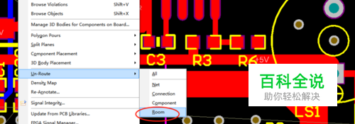 第四个选项“Component”,意思是取消指定的元器件的PCB布线,点击选中命令之后,再选中元器件(如电阻、电容或者芯片等)就可以消除所有引脚的布线