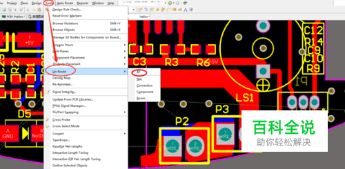 首先打开需要进行消除布线的PCB文件。然后在工具栏“tools”>“un-route”>可以看到有5个操作选项