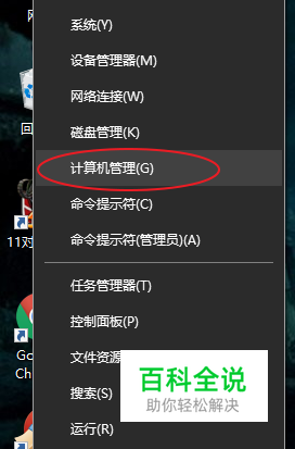 首先在开始按钮上点击右键,选择“计算机管理”。
