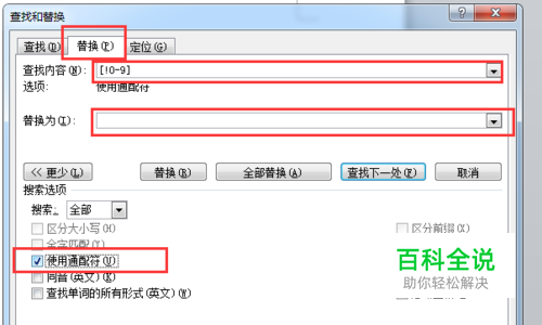 快捷键ctrl+H,弹出【查找和替换】对话框,在查找中输入[!0-9],替换为:留白,勾选通用配符。如图所示