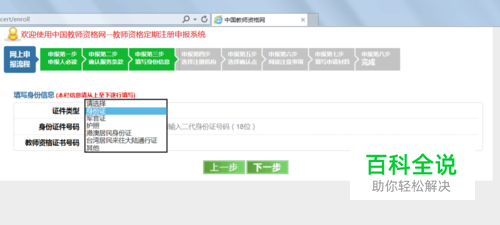 申报第三步、填写身份信息:填写身份证号码、教师资格证书号码,点击下一步,如图所示。