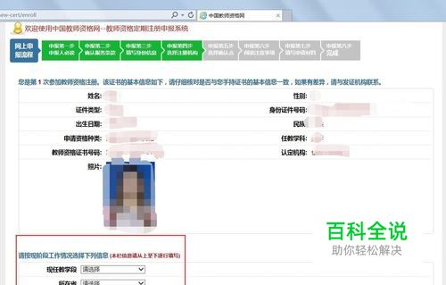 申报第四步、选择注册机构,核对证件信息,无误后按教师资格证书信息和现阶段工作情况如实填写信息(注册机构选择所在单位属地管理的县区教体局),如图所示。