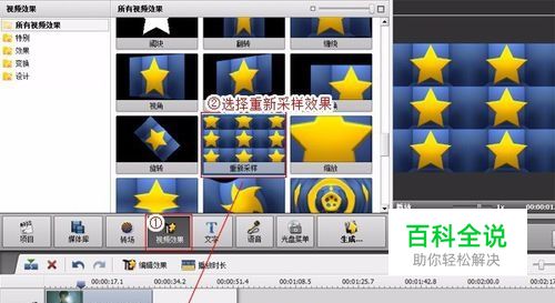 从软件中间的功能栏里找到“视频效果”并点击进入,从里面多种特效中找到“重新采样”这个效果,点击这个效果右边的预览框里就会显示该特效的效果,并按住重新采样特效往时间线面板里的视频效果轨里拖动,视频效果轨就在视频轨下面。