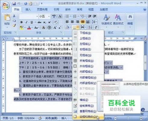 打开Word 2007文档窗口,选中需要设置图案底纹的段落。在“开始”功能区的“段落”分组中单击“边框”下拉三角按钮,并在打开的边框下拉列表中选择“边框和底纹”选项,如图所示。 选择Word 2007“边框和底纹”选项