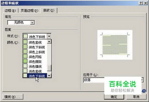在打开的Word 2007“边框和底纹”对话框中切换到“底纹”选项卡,在“图案”区域分别选择图案样式和图案颜色,并单击“确定”按钮,如图所示。 选择Word 2007图案样式和图案颜色