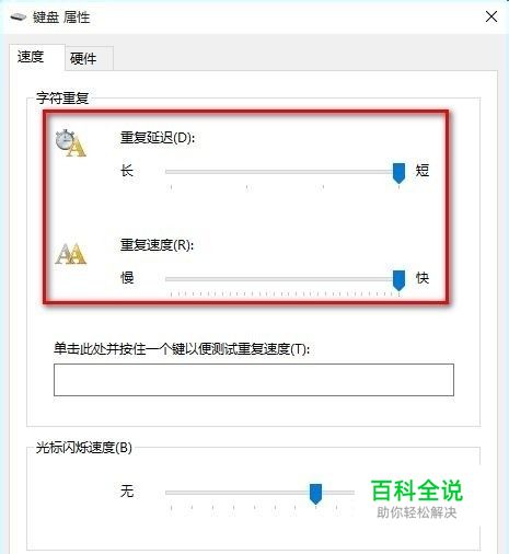 在打开的键盘属性窗口,在字符重复栏,把重复延迟(D)的滑块拉到最短位置,把重复速度(R)的滑块拉到最快位置,然后点击:确定。