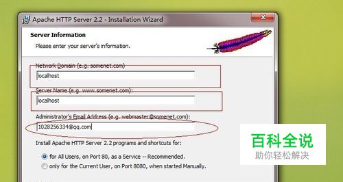 首先安装apache 在安装的过程中会出现填写用户邮箱等栏目 开始两个填写localhost即可 邮箱随便填写一个合法邮箱即可