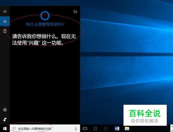 启动Windows 10操作系统,如图所示。点击任务栏搜索框,开始使用Cortana(小娜)智能语音助理。