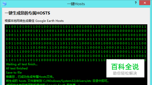 点击【一键Hosts】,在出现的界面中点击【start】按钮,开始生成专属hosts文件,生成完成后会自动弹出保存对话框 选择保存目录到桌面或者你能找到的位置,默认保存的文件名称就是hosts,无需修改。