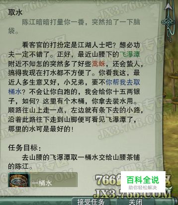 《取水》少林任务,任务描述:去山腰的飞瀑潭取一桶水交给山腰茶铺的陈江。飞瀑潭在哪,在完成任务的过程中需要注意些什么,一起来看看吧