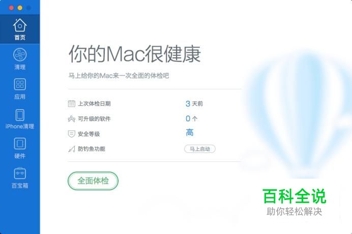 进入腾讯电脑管家界面,在首页中会提示电脑健康状态,点击“全面体检”