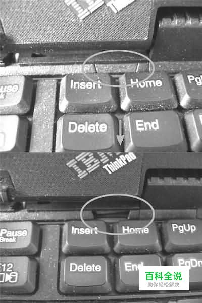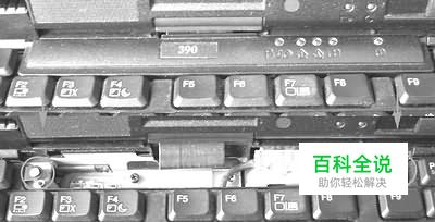 第二步,寻找机关。当把这两颗螺丝拧下后,试着抬起键盘,但好像还被什么东西固定住似的,随即顺着键盘周边寻找,果然在隐蔽的右上角发现了这个“机关”,只要把这块挡片用力向里推,键盘立刻就翘起了。