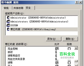 Step4 返回“图书编撰属性”对话框,在【共享权限】选项卡中选中刚刚添加的用户(如“寒江钓叟”)。然后在“寒江钓叟的权限”列表中选中【完全控制允许】复选框,并单击【应用】按钮,如图7-17所示。