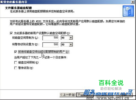 Step4 在打开的“文件服务器磁盘配额”对话框中选中【为此服务器的新用户设置默认磁盘空间配额】复选框,并根据磁盘存储空间及用户实际需要在【将磁盘空间限制为】和【将 警告级别设置为】编辑框中输入合适的数值(如500M)。另外,选中【拒绝将磁盘空间给超过配额限制的用户】复选框,可以禁止用户在其已用磁盘空间达到限额后向服务器写入数据。单击【下一步】按钮,如图7-4所示。