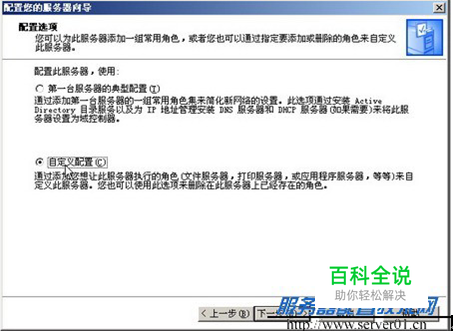 Step2 配置向导完成网络设置的检测后,如果是第一次使用该向导,则会进入“配置选项”对话框。选中【自定义配置】单选钮,并单击【下一步】按钮,如图7-2。