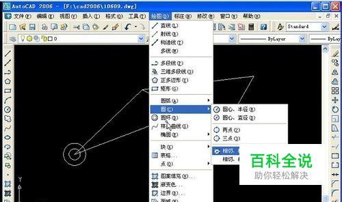 给定两切点和半径法:单击绘图菜单下圆命令,选择“切点、切点、半径”项,引动鼠标至相切线附近,出现切点符号时,单击左键,回车,在命令行输入半径,回车,完成圆的绘制。