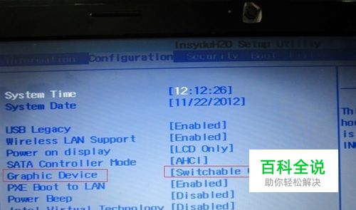 此机型为独立显卡机型:(此机型无Graphic Device项) BIOS设置方法: 双显卡机型需要设置显卡模式,不然有些机型可能装不上显卡驱动