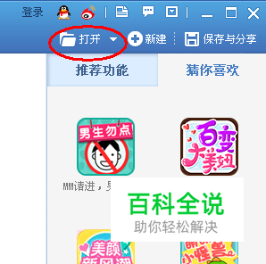 运行美图秀秀软件,点击右上角的“打开”,在弹出的窗口中选择待处理图片。如下图: