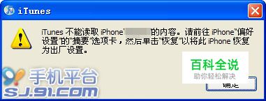 “iTunes不能读取iPhone的内容,请前往iPhone偏好设置的摘要选项卡,然后点击“恢复”以将此iPhone恢复为出厂设置。”的提示,点击确定后可以看到iPhone只能进行恢复操作。