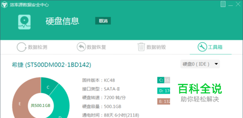 点击“硬盘温度”,进入硬盘信息,可以查看硬盘的固件版本、接口类型、转速、容量、序号、缓存大小、分区及分区大小信息。通过与包装盒上的信息,以及硬盘厂商官网上的信息进行对比,也可以鉴定移动硬盘有没有问题。