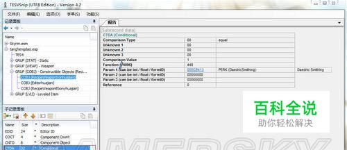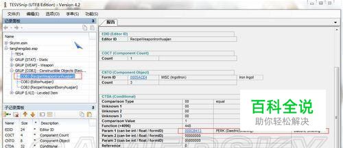 首先下载TESVsnip这个软件,论坛内就有,搜索一下吧。 然后,打开软件,加载skyrim.esm和XXX.esp(XXX是你下的武器MOD)。 定位到左边红框那一栏,右边红框里显示的就是锻造武器所需的perk,图中可以看出是需要魔族的perk。这里要注意的是,如果你只加载了esp文件,而没有加载esm文件的话,就只显示前面的代码,后面两栏是看不到的。
