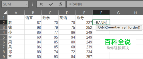首先在要排序单元格右方单元格插入RANK函数【在单元格内输入"=RANK("】 ps:括号一定是英文的括号