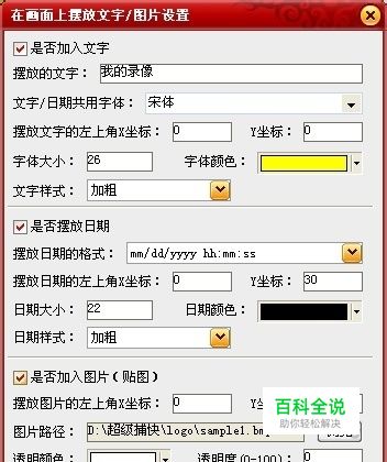 为视频添加文字、水印以及日期等 作为当下最好的摄像头录像软件,超级捕快支持为摄像头录像添加文字说明、图片、也支持即时捕捉静态图片等等,功能非常强大且具有特色。设置文字/贴图功能可以为摄像头视频添加文字、图片,记录当前日期,录制具有独特标志的视频。如下图: