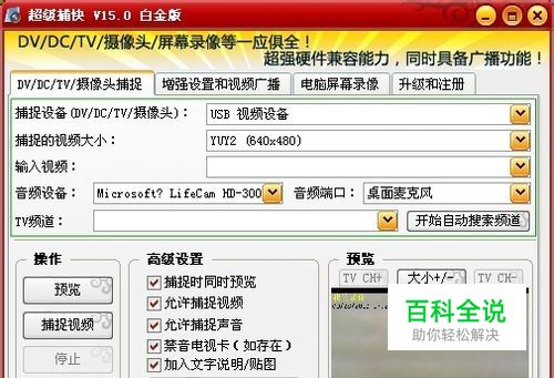 点击“DV/DC/TV/摄像头捕捉”选项,录制摄像头视频 如下图所示,我们可以设置捕捉设备、捕捉视频的大小。在“音频设备”处选择你的声卡名称,在“音频端口”处设置正确的端口,边录视频,边录声音的效果。如果你想要演奏一段古筝视频或笛子视频,都是可以通过摄像头进行捕捉录制的。