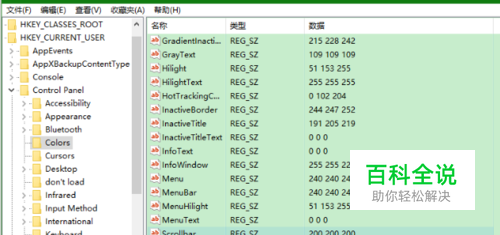 根据路径找到:HKEY_CURRENT_USER->Control Panel->Colors ,找到“window”