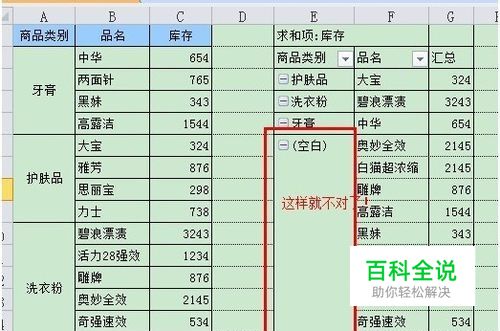 4、最后的结果,如下图所示。我们发现商品名称列仍有合并样子,但是数据透视表仍然能正常显示。也就是说,格式刷只改变了显示的格式,每行中的数据仍然存在。