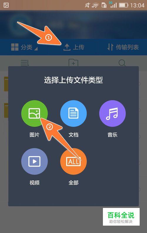 用注册的账号登录成功后,这里如果需要将手机里的照片或视频上传到网盘的话,那么就点击上面的那个“上传”,如下图箭头1所指,再根据需要点图片或视频按钮。