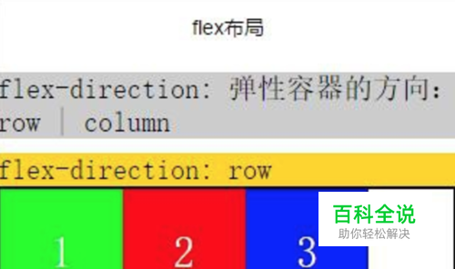 flex-direction属性表示布局的方向 有两个值: row | column 默认属性是row 行布局,先来看看flex-direction:row的效果 <view class="section"> <view class="section__title">flex-direction: row</view> <view class="flex-wrp" style="flex-direction:row;"> <view class="flex-item bc_green">1</view> <view class="flex-item bc_red">2</view> <view class="flex-item bc_blue">3</view> </view> </view>