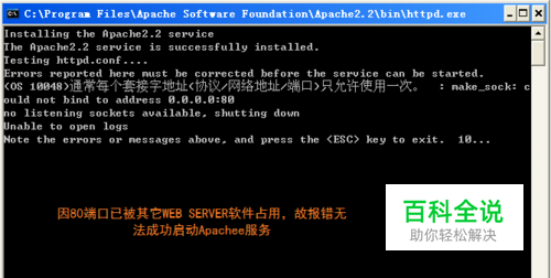在WEB SERVER界,不管是微软的IIS还是世界排名第一的Apache,它们安装好后默认的网页服务端口号都是80。有必要指出的是,如果你的电脑中已经安装有某种WEB SERVER软件(如IIS),想要再增加一种WEB SERVER软件(如Apache)的话,那么必须先修改前者默认的网页服务端口80,否则可能会无法完成安装(见下图)。其它主流的和非主流的WEB SERVER也都如此。当然,今天的主角是Apache,如何修改它的默认网页服务端口号?且看下面细细道来: