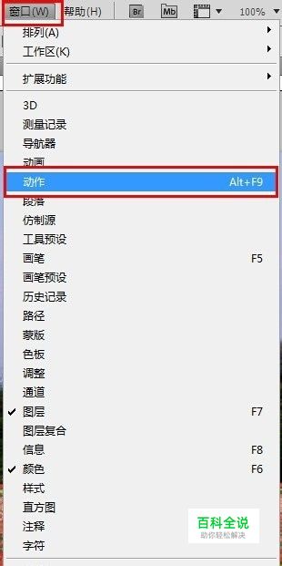 点击菜单栏上“窗口”找到“动作”,也可以只用快捷键"ALT+F9”组合键