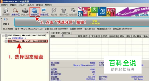 进入到U帮忙PE桌面后,双击打开桌面的diskgenius工具,打开后在左侧选择固态硬盘,然后点击上方的“快速分区”按钮。如下图所示