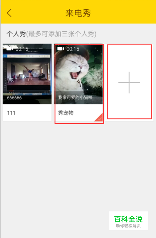 3、点击“+”上传您的来电秀图片或视频。PS:初次设置下面三个位置均空白,可随意点击设置。