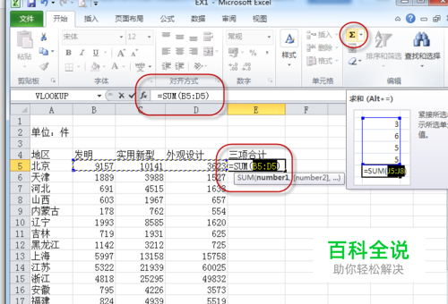 方法一: 选定好单元格,在编辑栏中输入=SUM( ), 括号中是需要相加的数,可直接输入相加数的单元格号或点击需要相加的单元格,例,如图B5+C5+D5就是9157+10141+3623对应的单元格;