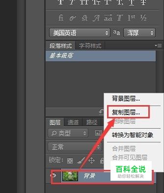用鼠标右击背景图层,选择“复制图层”,在弹出的对话框点击“确定”,这样就复制了一个名叫“背景拷贝”的图层。(或者按Ctrl+J快捷方式,也可以复制一个图层)