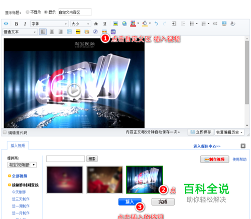 第二:插入完视频后,点击编辑后台的按钮,复制需要的代码放进下面的代码模板中: <tr> <td style="overflow:hidden;"> <div style="width:1920px;height:1540px;overflow:hidden;"> <img src=图片链接" width="1920" height="1540" alt="" /> <div style="position:relative;top:-1178px;left:485px;"> <embed allowfullscreen="true" src="//cloud.video.taobao.com/play/u/3368316907/p/2/e/1/t/3/50050720908.swf#tb_videoid=9468933" height="540" width="1040" allowscriptaccess="never" flashvars="scene=taobao_shop" type="application/x-shockwave-flash"> </embed> </div> </div> </td> </tr>