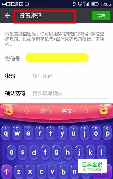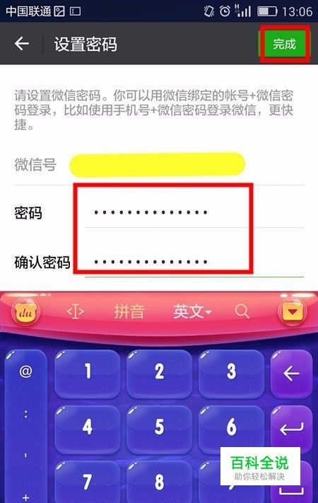 我们按要求填写密码和确认密码,随后点击选择该页面右上角的“完成”即可;