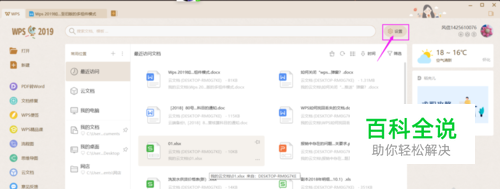 方法一: 打开程序wps2019,进入wps首页界面,屏幕右上角,鼠标单击“设置”,如下图所示: