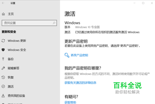 最后打开“设置”界面,依次进入“系统和更新”-“激活”界面,就会发现Win已激活。如图所示: