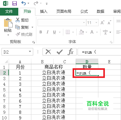5.如图,这时松开shift,点击enter。这时就汇总各供应商各个月份洗衣粉的数量。
